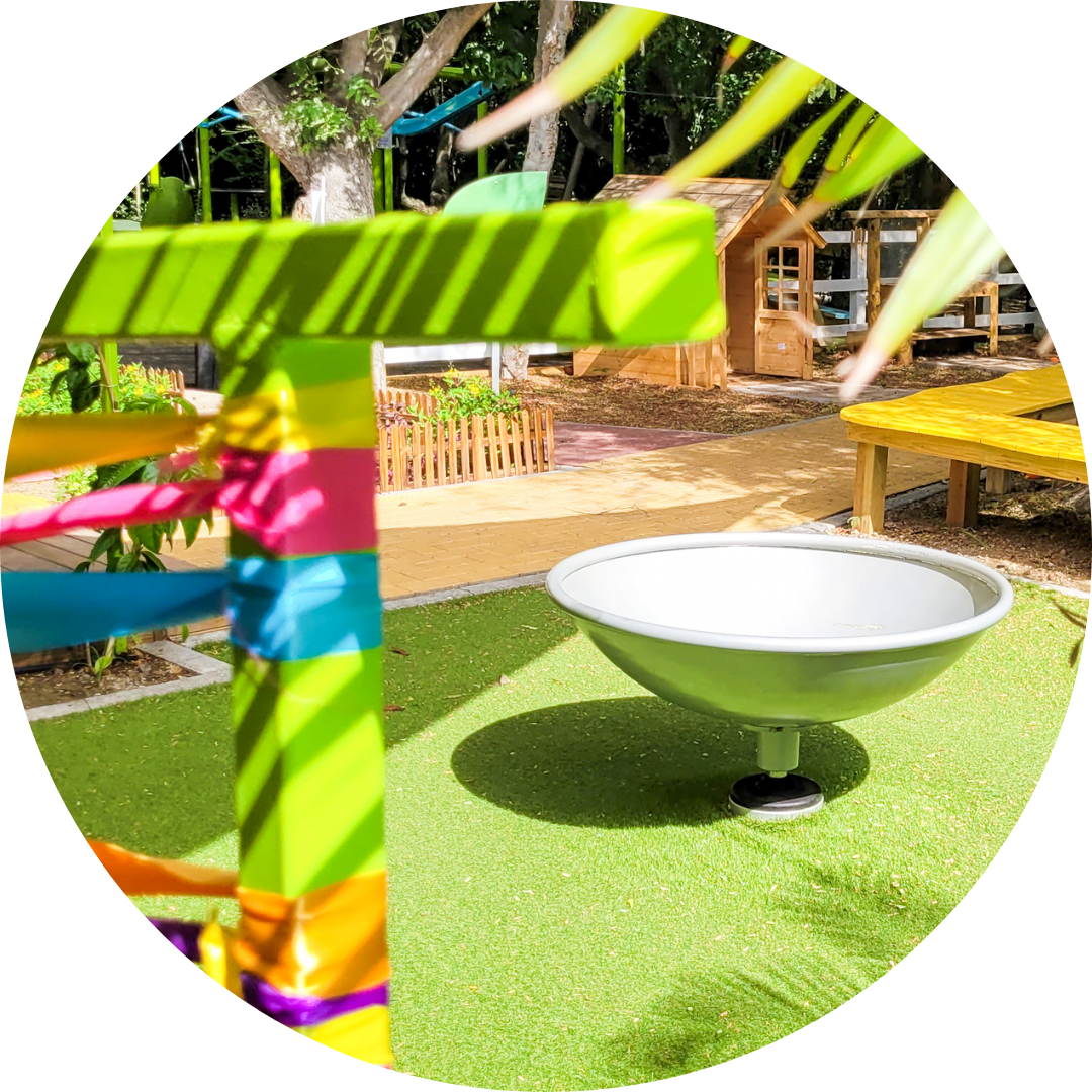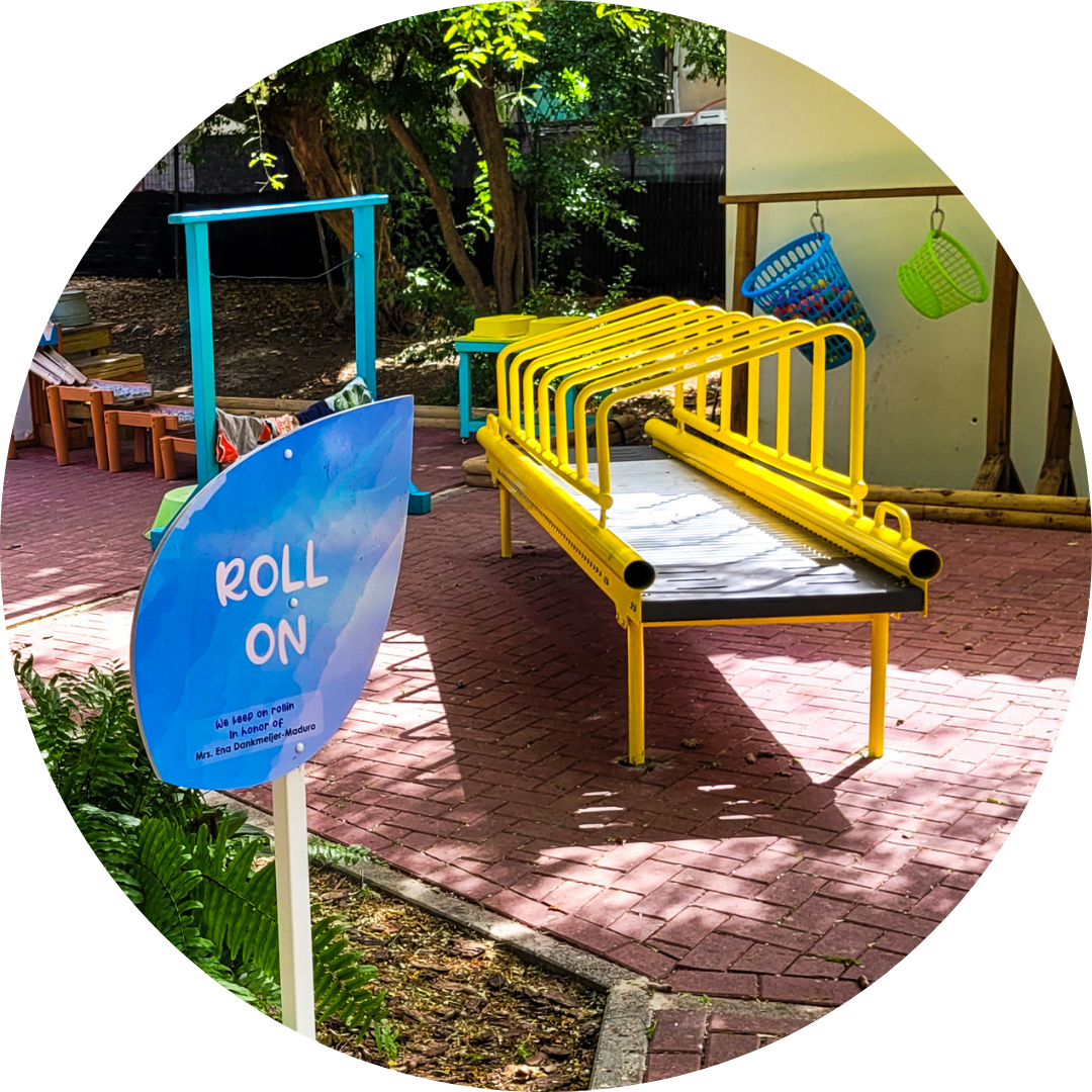 Under the lush Tamarinda tree, the Roller Table offers a fast, fun ride while providing sensory stimulation through deep muscle pressure from steel rollers